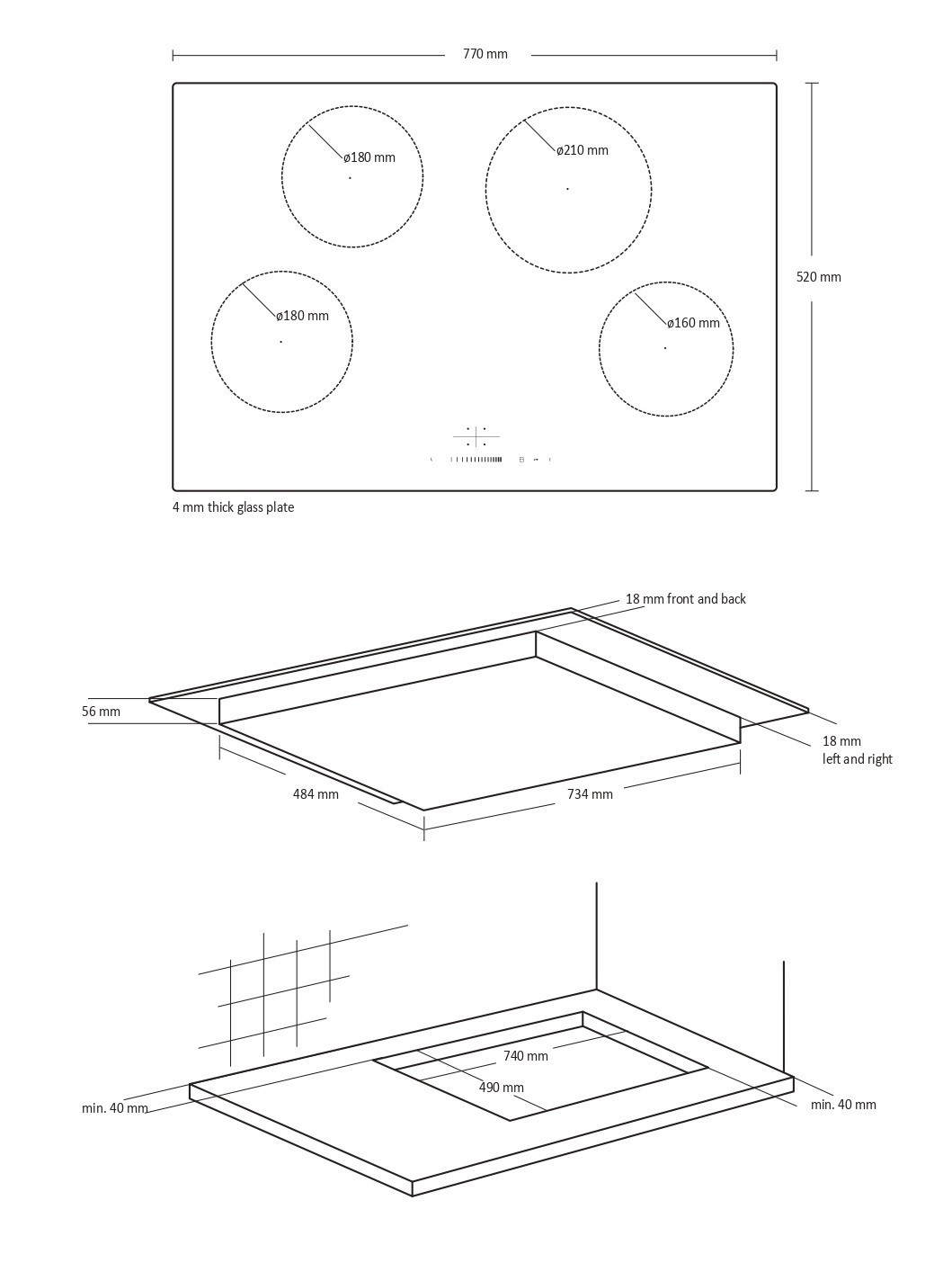Keedualad: vasakpoolne esimene keeduala 18 cm/ 2300 W, vasak tagumine keeduala 18 cm/ 2300 W, parem esimene 16 cm/ 1500 W ja parem tagumine 21 cm/ 2600 W.