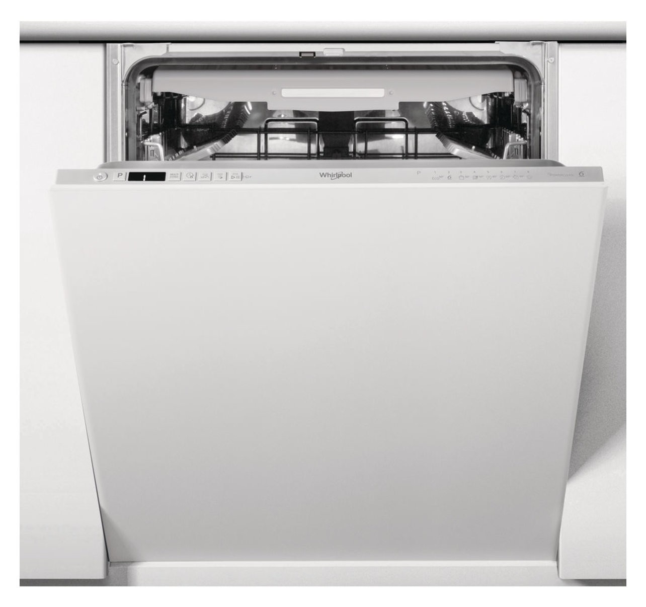 Energiasäästlik Whirlpool integreeritav nõudepesumasin automaatse ukse avamisega pesutsükli lõpus.