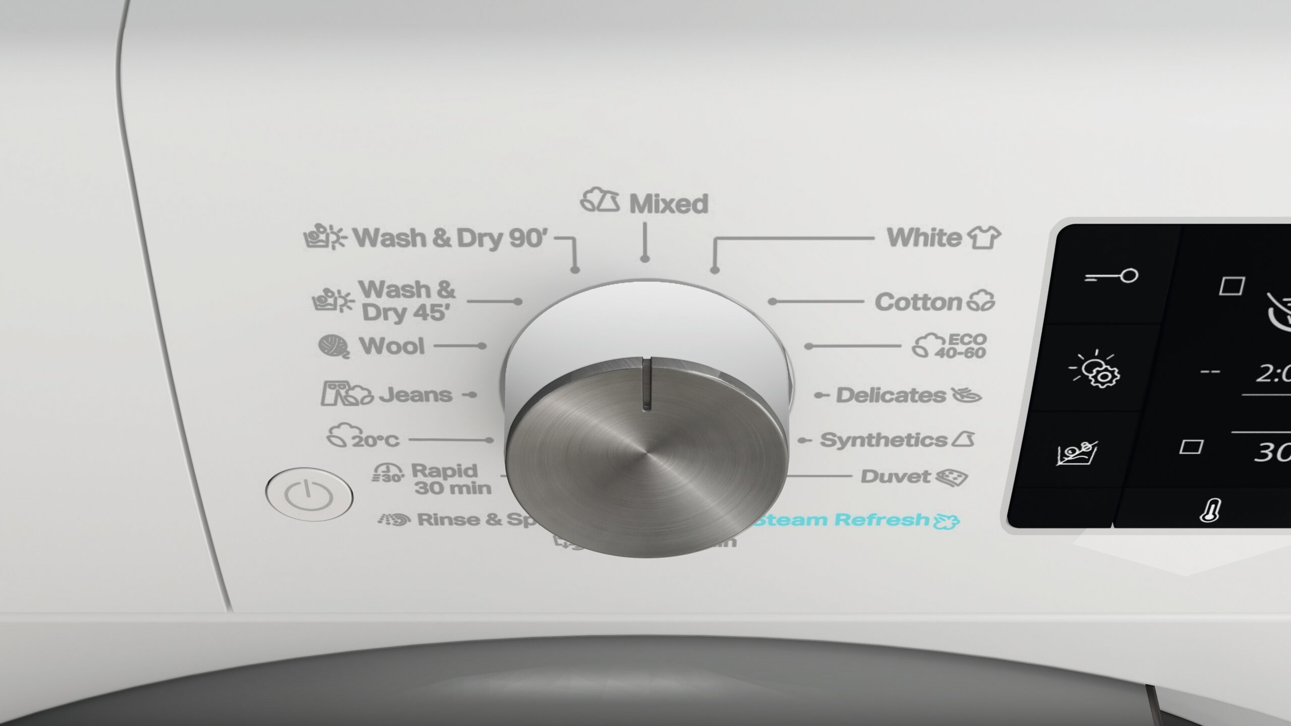 Programmid: segapesu, valge, puuvillane, Eco 40-60, õrn, sünteetiline, suured esemed, auruvärskendus, loputus & tühjendus, loputus & tsentrifuug, kiire 30′, 20°C, teksad, villane, pesu & kuivatus 45′, pesu & kuivatus 90′