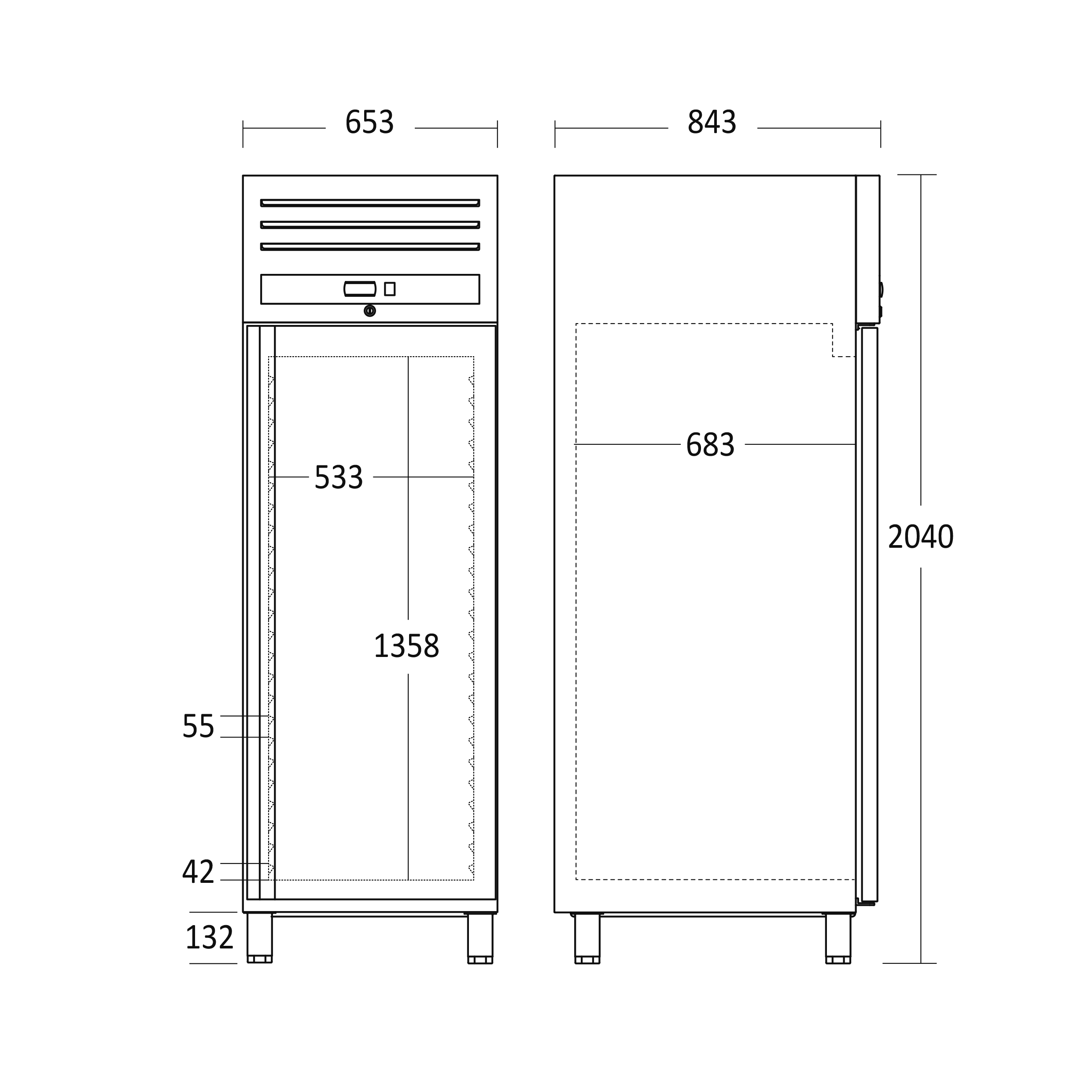 Hoiustamine – kergesti eemaldatavad ning ümber paigutatavad restid 40 kg kandevõimega (resti mõõt 530 x 650 mm); 23 riiuli kõrgusastmed on paigutatud 55 mm vahega. Uks on võtmega lukustatav.