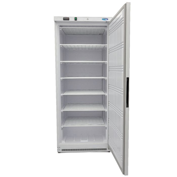 Valget värvi sügavkülmik, millel on 6 fikseeritud riiulit.